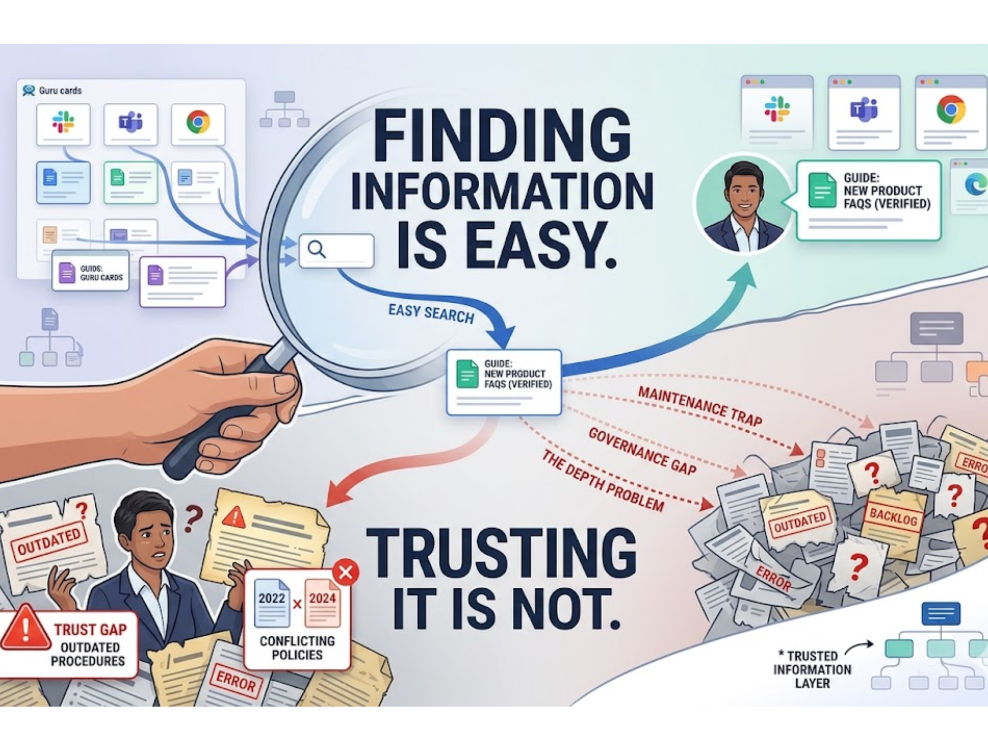 The first wave of knowledge management was about making information findable. The next wave is about making it trustworthy enough to rely on without a second round of verification. The question is not whether tools like Guru work. They do. The question is what teams need once "finding the card" is no longer the bottleneck.